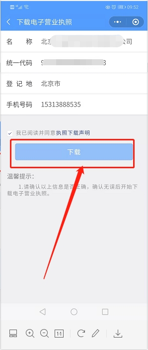 進(jìn)入“電子營(yíng)業(yè)執(zhí)照”程序之后,點(diǎn)一下“下載執(zhí)照”模塊,填寫一下名字,身份證號(hào)碼和手機(jī)號(hào)碼,點(diǎn)擊確定,進(jìn)入下一個(gè)界面,點(diǎn)擊授權(quán),在最后一個(gè)界面掃臉實(shí)名認(rèn)證,認(rèn)證完成,在點(diǎn)擊一下登記地后面的小箭頭,選擇公司對(duì)應(yīng)的注冊(cè)地址登記地“北京”,在已查詢出可下載的記錄模塊,選擇要下載公司的電子營(yíng)業(yè)執(zhí)照,在對(duì)應(yīng)的公司名稱上面點(diǎn)擊一下,核對(duì)信息無(wú)誤后,點(diǎn)擊下載,下載成功后電子營(yíng)業(yè)執(zhí)照就可以正常使用了,以后也可以不進(jìn)入小程序,直接用微信或者支付寶掃一下二維碼就可以。(重要事情說(shuō)三遍,電子營(yíng)業(yè)執(zhí)照初始密碼123456,電子營(yíng)業(yè)執(zhí)照初始密碼123456,電子營(yíng)業(yè)執(zhí)照初始密碼123456)