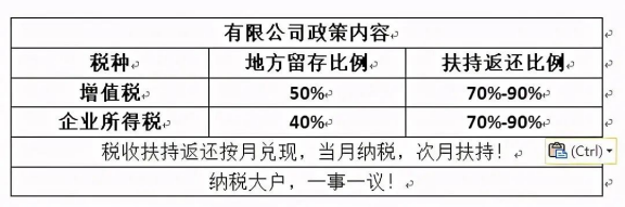 稅收獎勵返還的主要內(nèi)容就是:在增值稅、企業(yè)所得稅的地方留存部分的基礎上,進行70%-90%比例的稅收返還,一是對企業(yè)納稅的獎勵;同時也是緩解企業(yè)的稅負壓力和減輕企業(yè)運營成本,以期待企業(yè)做大做強,后期為政府提供更多的稅收收入。