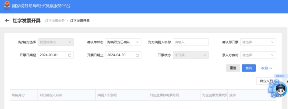 當(dāng)紅字信息確認(rèn)單狀態(tài)為購(gòu)銷(xiāo)雙方已確認(rèn)狀態(tài)或無(wú)需確認(rèn)狀態(tài)時(shí),納稅人可依次進(jìn)入【我要辦稅】—【開(kāi)票業(yè)務(wù)】—【紅字發(fā)票開(kāi)具】頁(yè)面,在常用功能模塊中點(diǎn)擊“紅字發(fā)票開(kāi)具”,錄入查詢(xún)條件查詢(xún)到此前開(kāi)具的紅字信息確認(rèn)單,點(diǎn)擊右側(cè)的“去開(kāi)票”,進(jìn)入紅字發(fā)票開(kāi)具頁(yè)面,之后正常開(kāi)具紅字發(fā)票即可。