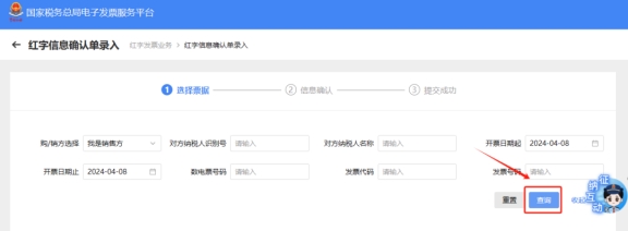 四、錄入查詢(xún)條件查詢(xún)到此前開(kāi)具的紅字信息確認(rèn)單,點(diǎn)擊右側(cè)的“去開(kāi)票”,進(jìn)入紅字發(fā)票開(kāi)具頁(yè)面,之后正常開(kāi)具紅字發(fā)票即可。