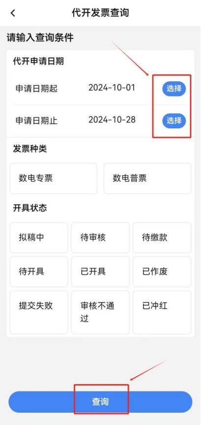 點(diǎn)擊首頁(yè)“代開(kāi)增值稅發(fā)票”,點(diǎn)擊“代開(kāi)發(fā)票信息查詢”,選擇提交申請(qǐng)的起止日期,點(diǎn)擊頁(yè)面下方的“查詢”。