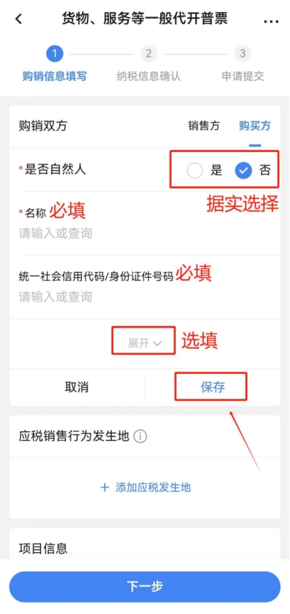 點(diǎn)擊“購(gòu)銷(xiāo)雙方”一欄中的“銷(xiāo)售方”,核驗(yàn)個(gè)人身份信息是否正確(銷(xiāo)售方僅能為登錄APP的用戶本人),無(wú)誤后點(diǎn)擊“購(gòu)買(mǎi)方”,點(diǎn)擊“添加購(gòu)買(mǎi)方”,根據(jù)實(shí)際情況選擇“是否為自然人”并填寫(xiě)“名稱(chēng)”及“統(tǒng)一社會(huì)信用代碼/身份證件號(hào)碼”(點(diǎn)擊“展開(kāi)”可填寫(xiě)更多信息,可根據(jù)開(kāi)票需求自行選擇填寫(xiě),非必填項(xiàng)),填寫(xiě)完成后點(diǎn)擊“保存”。