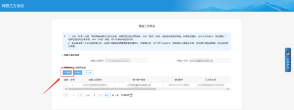 四、選擇銀行信息點(diǎn)擊確認(rèn)分別根據(jù)需要選擇或填寫清算行行號、批扣標(biāo)志、辦理人員身份證件號碼然后點(diǎn)擊下一步,再返回網(wǎng)簽三方協(xié)議界面。選擇新增的信息點(diǎn)擊驗(yàn)證,協(xié)議狀態(tài)變?yōu)轵?yàn)證通過說明三方協(xié)議簽定成功。