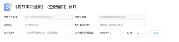 三、《稅務(wù)事項通知》(登記通知)補(bǔ)打界面,文書制作日期起:選擇一般納稅人生效年份的1月1日,文書制作日期止:選擇生效日期同年的12月31號(例:一般納稅人有效期起是2020-6-1,文書制作日期起是2020-1-1,文書制作日期止是2020-12-31)。