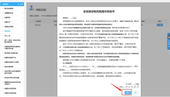 二、發(fā)票使用—風(fēng)險(xiǎn)告知,進(jìn)入雙向?qū)嵜J(rèn)證模塊(此處只顯示當(dāng)前登錄人員的信息,所以需要給誰(shuí)做雙向?qū)嵜J(rèn)證,則需要使用該人員的信息驗(yàn)證登錄),點(diǎn)擊【本人確認(rèn)】。